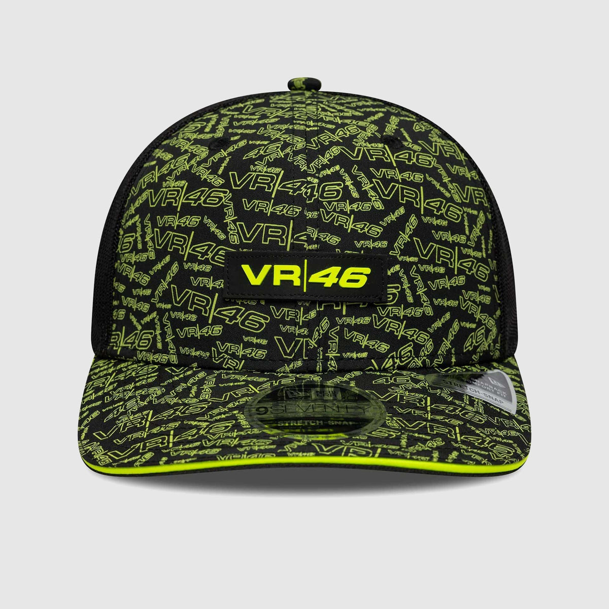 La gorra VR46 9SEVENTY de New Era forma parte de la colaboración oficial entre Valentino Rossi y New Era. Confeccionada en poliéster, presenta un estampado all-over en el panel frontal y un parche de goma con el logo VR|46. La parte trasera incorpora paneles de malla respirable para mayor ventilación, junto con la bandera New Era bordada en el lateral, y cuenta con cierre ajustable en la parte posterior para un calce cómodo.
